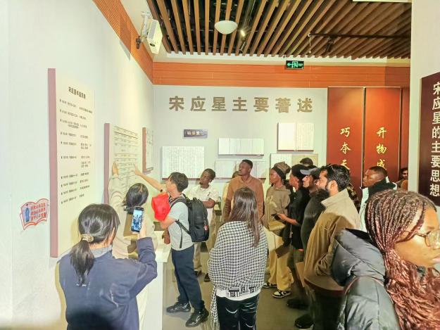活动的最后一站是宋应星纪念馆。在此,留学生们追寻明代科学家宋应星的科研足迹,深入探讨了《天工开物》中与中医药制备工艺密切相关的记载。《曲蘖》一卷中系统记载了酒曲制作和酿酒技术,留学生们了解到酒在中医里本身就是一味药材,具有活血通络、散寒止痛的功效,更是制备药酒的重要溶媒。《膏液》卷中详细记载的从樟木中煎制樟脑的工艺,同样引起了学生们的浓厚兴趣。这种通窍、杀虫、止痛的药材,其传统制作方法在书中得到了完整呈现。而更为名贵的“龙脑冰片”作为开窍醒神的珍稀药材,其制备工艺也在书中有所提及。《天工开物》不仅是一部科技著作,更是中医药制备技术的重要文献。其中记载的药物加工方法,展现了古人将自然原料转化为医药的卓越智慧,让这些来自不同国家的留学生们惊叹不已,为中国古代卓越的科技成就深深折服。
