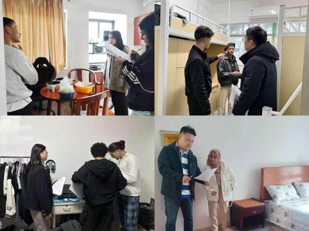 为进一步筑牢校园安全防线,营造整洁文明的住宿环境,海外教育学院于12月17日下午组织开展了留学生宿舍安全检查及文明寝室评选活动。本次活动由学院领导带队,留学生辅导员及各科室老师共同参与,分组对校内4栋留学生公寓的近400间宿舍进行了全覆盖检查。